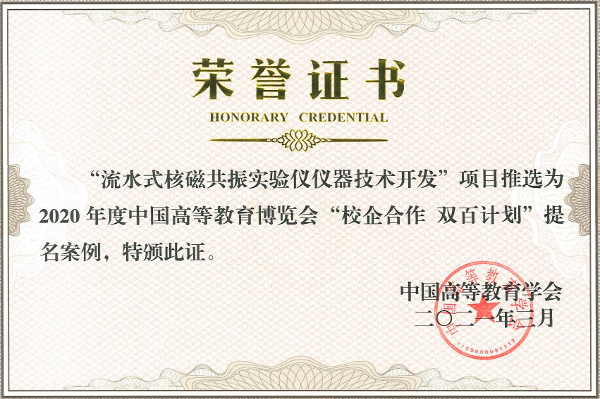 2021年4 月15日,长春市长城教学仪器有限公司与吉林大学共同研制的“流水式核磁共振实验仪”获得中国高等教育学会关于推选2020年度中国高等教育博览会“校企合作 双百计划”典型案例。