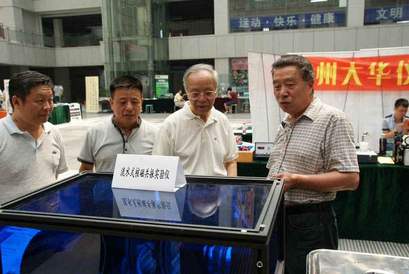 6、吉林大学张志杰老师向我国物理实验专家、北京大学吕斯骅教授介绍流水式核磁共振实验仪: